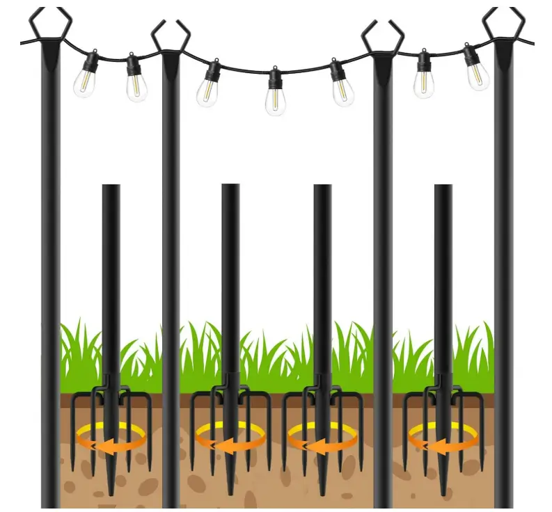 The LETIANPAI 4 Pack String Light Poles provide sturdy 10 ft metal poles with forked bases that keep outdoor string lights securely in place on grass, soil, or soft ground. Their durable construction and stable design make them ideal for patios, decks, backyards, gardens, weddings, and outdoor parties. With easy installation and reliable support, they help you create a beautifully lit atmosphere for any event or outdoor space