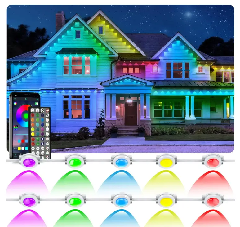 These RGB eaves lights come with both app control and a remote, which makes adjusting them incredibly convenient no matter where I am. The setup process was surprisingly straightforward, and I appreciated how quickly everything connected and responded. With the DIY scene modes, I was able to customize the colors and patterns to match different moods, seasons, and occasions without any hassle. The IP67 waterproof rating has already proven its worth, as the lights have handled rain, humidity, and damp evenings without a single issue. It’s reassuring to know they’re built for long-term outdoor use and won’t fail after the first storm. These lights are not only perfect for outlining the eaves but also do a great job enhancing the overall appearance of the garden and exterior of the house. Whether I’m using them for everyday ambiance or for special events like holidays, parties, or family gatherings, they deliver vibrant and reliable illumination every time. The brightness is impressive and the colors stay consistent along the entire length. The 300-foot coverage is a huge benefit because it allows the entire porch and surrounding areas to have a cohesive, festive glow. The materials feel durable and high-quality, giving me confidence that they’ll last for many seasons. If you’re searching for permanent outdoor lighting that combines flexibility, long-lasting durability, and smart control features, these lights are definitely worth considering.